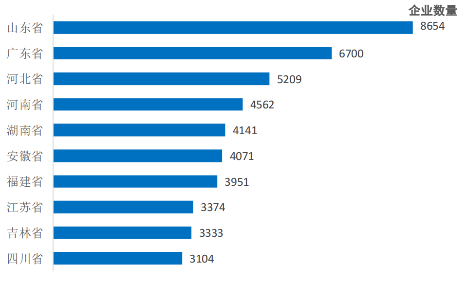 通过梳理头部企业所属地域发觉, 广东省位居榜首,山东和浙江,企业数量均大于或等于10家;福建、、湖南、江苏、河南各有跨越5家企业。