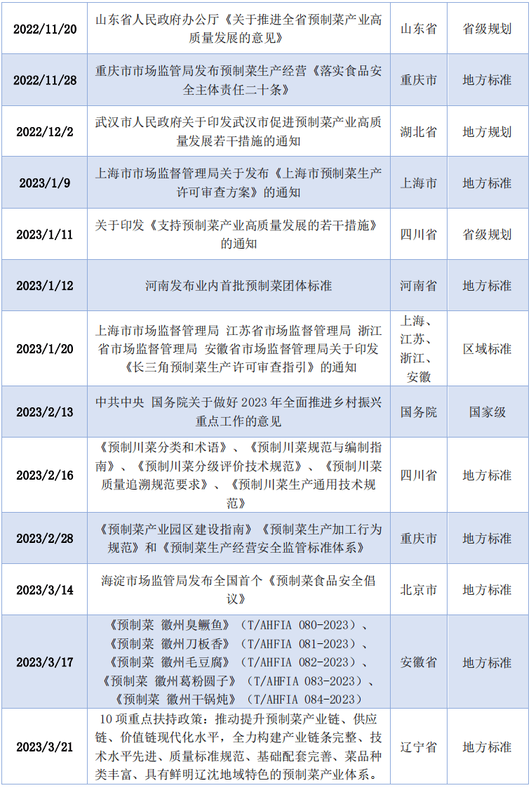 环绕预制菜,2022年4月,出台《市预制菜财产高质量成长三年步履打算(2022—2024)》和《市支撑预制菜财产高质量成长九条政策办法》;2022年6月,印发《关于加速推进预制菜财产成长的若干办法》;2022年6月,出台《市预制食物财产成长规划》。