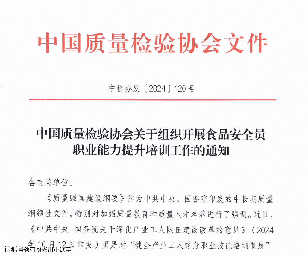 食物平安员职业前景广漠且积极。跟着社会对健康日益注沉及监管系统持续完美,食物行业对专业人才的需求持续扩大。该职业不只就业不变,笼盖出产、餐饮、畅通等浩繁范畴,更具备清晰的晋升径,可向质量办理担任人等办理层成长。专业能力凸起的食物平安员价值凸显,职业成长不变而。《关于深化财产工人步队扶植的看法》(2024年10月12日印发)更是对“健全财产工人终身职业技术培训轨制”“落实企业培育财产工人的义务”“阐扬行业协会、社会培训机构感化,帮帮中小企业开展技术培训”等做出了明白摆设。按照《食物平安法》、《劳动法》等法令律例的,按关决策摆设和《企业落实食物平安从体义务监视办理》(市场监管总局令第60号)等从管部分的政策要求,为了深切贯彻落实新时代人才强国计谋,督促泛博企业和查验检测机构提拔承担质量平安从体义务的能力,引领食物平安员精确把握其职责和权限并持续提拔岗亭履责能力,持续深切贯彻落实食物平安工做“四个最严”的要求,出力阐扬质量查验行业组织正在“党委带领、从导、政策支撑、企业从体、合力推进质量社会共治,帮力提拔食物平安员专业素养能力和程度,指导企业加强质量工做,推进企业产物和办事质量提拔,充实阐扬食物平安员正在产质量量提拔中的主要感化,办事高质量成长,推进质量强国扶植,中国质量查验协会组织开展食物平安员职业能力提拔培训工做。 食物平安范畴相关的法令律例和部分规章、食物平安职业扶植、食物平安强制性国度尺度、食物平安规范性文件政策解析、食物平安根本理论、食物平安办理根基技术、相关案例解析等。本协会结合相关培训专业机构配合邀请相关经验丰硕的资深专家组编培训材料并以讲课、答疑、交换等相连系的体例,切实确保培训质量。正在上述培训工做中,将由加入培训的登录中国质量查验协会网坐中国质量网,并按关授权进入线上培训办事平台进行培训报名、培训进修和培训测验。